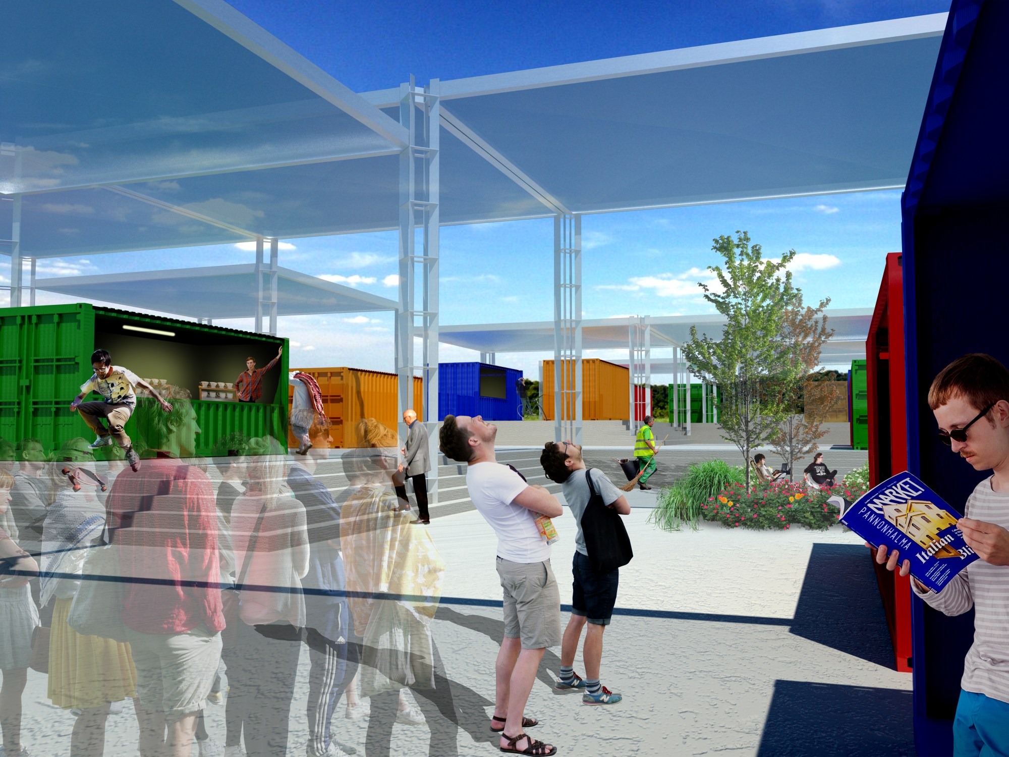 Design: Using and transforming shipping containers into these necessities. Combining this with a light mobile structure to provide shelter makes the whole project very flexible. This gives the project different layouts for different scenarios in which it may encounter (events, seasons, weekdays, weekends, etc.). There are also various types of market stalls, each modified depending on their use. Tables are also include into the project for locals to be able to come and sell their own produce.